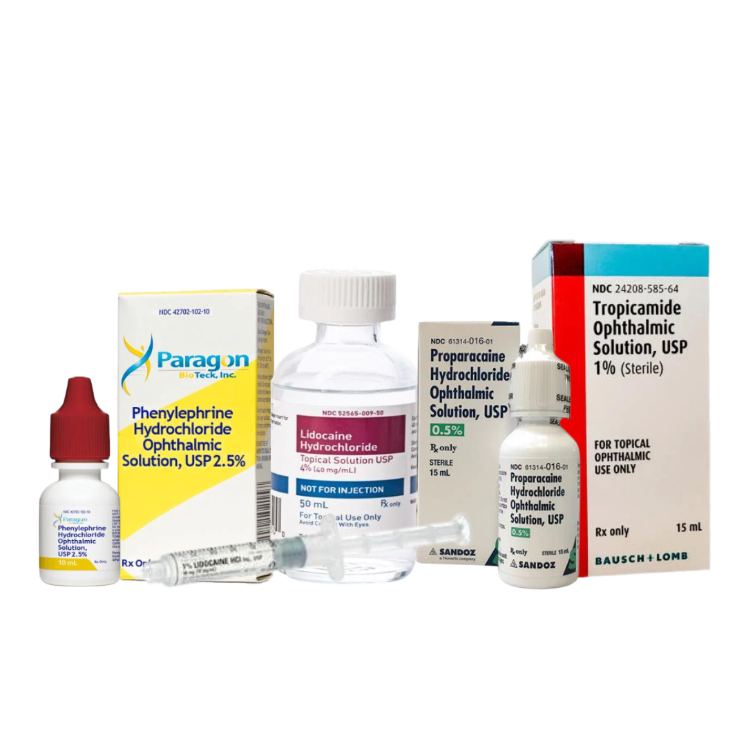 - Diagnostics (Fluorescein, Proparacaine, Tropicamide, Phenylephrine, Atropine, et Al.;